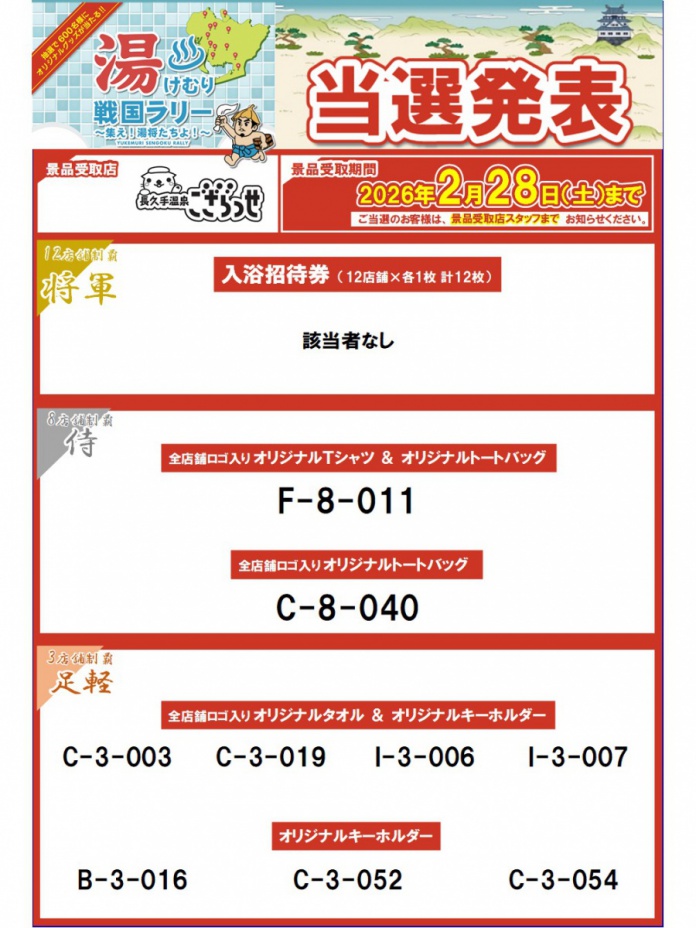 ・湯けむり戦国ラリーの当選者へ、ござらっせよりご連絡を差し上げます。 ・ござらっせ横の神戸珈琲倶楽部にて景品のお渡しが可能となりました。 ※神戸珈琲倶楽部での景品お渡し可能時間 AM8:00からPM15:30まで ※毎週月曜日(祝日の場合翌平日)は神戸珈琲倶楽部定休日の為受け渡し不可